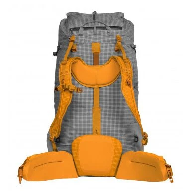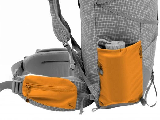 The padded shoulder yoke, with sternum strap, slides along the the stay, allowing a wide range of vertical, micro-adjustment to precisely match the wearers torso length while reducing contact points to a minimum. Stretch pouches on each side hold water bottles, trekking poles or tent poles and zippered stretch pockets on each hip belt wing hold small items for quick access.